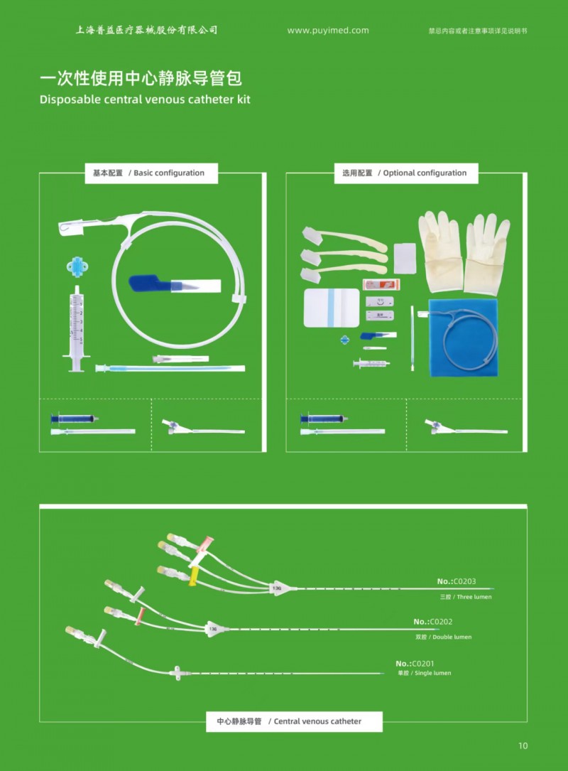 產品基本配置:導管、導引導絲、Y型穿刺針或穿刺針+藍空針、擴張器、單通道延長管、多通道延長管、三通閥、肝素帽、破皮刀。