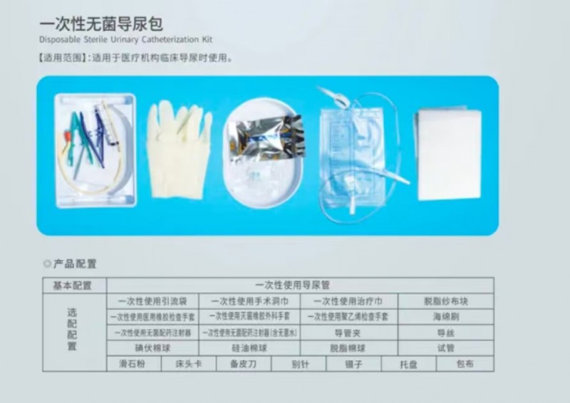 結構及組成 本產品由基本配置一次性使用導尿管和選配配置一次性使用引流袋、一次性使用手術洞巾、一次性使用治療巾、脫脂紗布塊、鑷子、一次性使用橡膠檢查手套、一次性使用滅菌橡膠外科手套、一次性使用聚乙烯檢查手套、一次性使用無菌配藥注射器、一次性使用無菌配藥注射器(含無菌水)、碘伏棉球、硅油棉球、脫脂棉球、備皮刀、海綿刷、別針、試管、導管夾、導絲、滑石粉、床頭卡、托盤、包布組成。