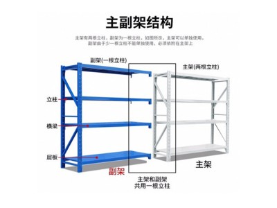 中型貨架是由立柱,橫梁,層板組裝而成的,獨立的一組有兩片立柱,這樣的貨架叫做主架。如果把幾組組裝成為一列,那么除了第一組需要兩片立柱外,其他的可以和它前面的一組共用一片立柱,這樣的貨架叫做副架。