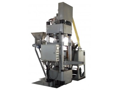 混合好物料→加入設備后上方料斗→料斗內的料定量加入加料框內→加料缸帶動加料框前進,把料加入模具內,接著加料缸退回復位→子缸帶動主缸活塞桿和沖頭快速下壓→當沖頭進入模腔后,子缸轉入主缸慢下加壓,將模具內的物料用高壓壓制成高密度舔磚塊(脫模浮動缸同時下降,實現雙向浮動壓制)→主缸微升(沖頭不出模具)→脫模浮動缸帶動模框下落,把舔磚塊從模具中脫出→抽芯缸抽出芯桿→子缸及主缸上升→加料缸前進把成品推出的同時加料框移動至模具上方→脫模缸帶動模框上升形成空腔完成加料,并進入下一次循環程序